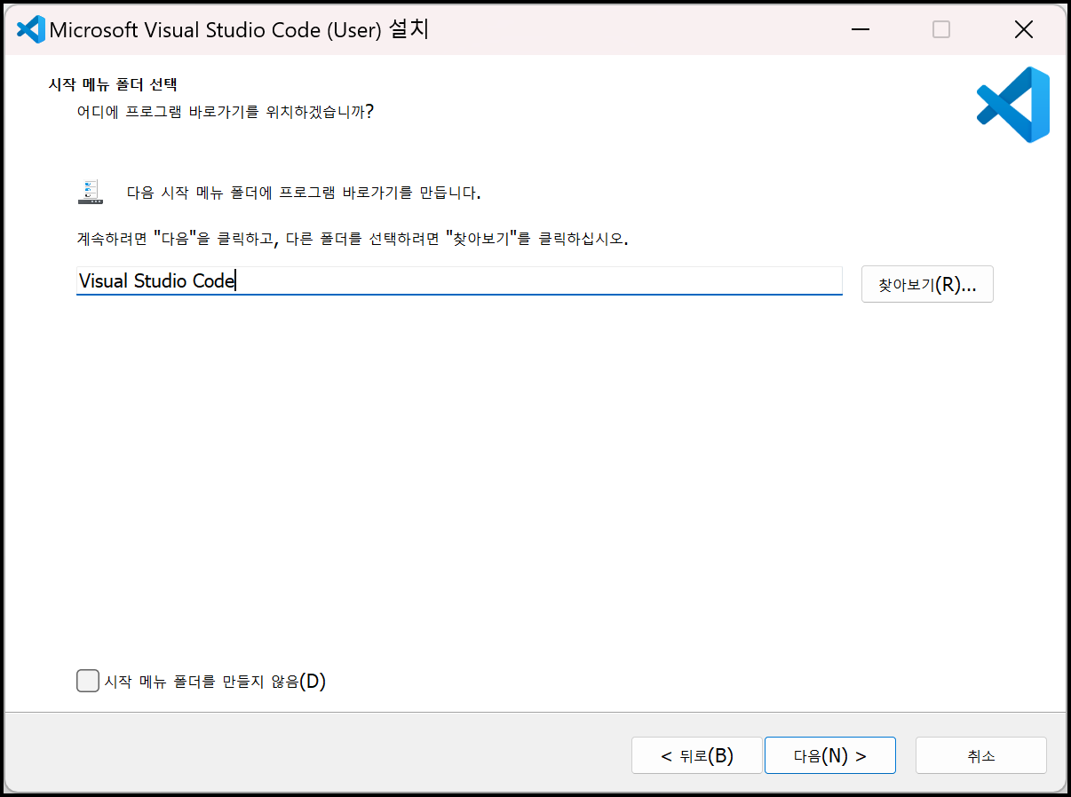 원하지 않으신다면 아래 시작 메뉴 폴더를 만들지 않음을 체크한 후