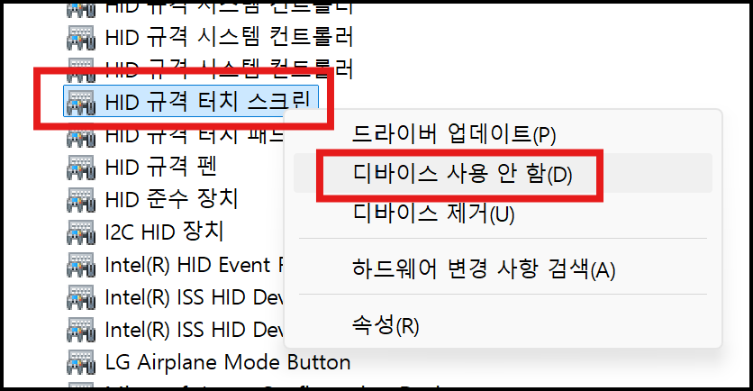 아래쪽에 [HID 규격 터치 스크린] 항목이 있습니다.