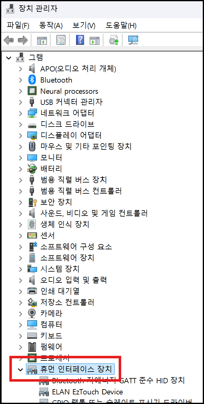 [휴먼 인터페이스 장치] 항목이 있습니다. 클릭.