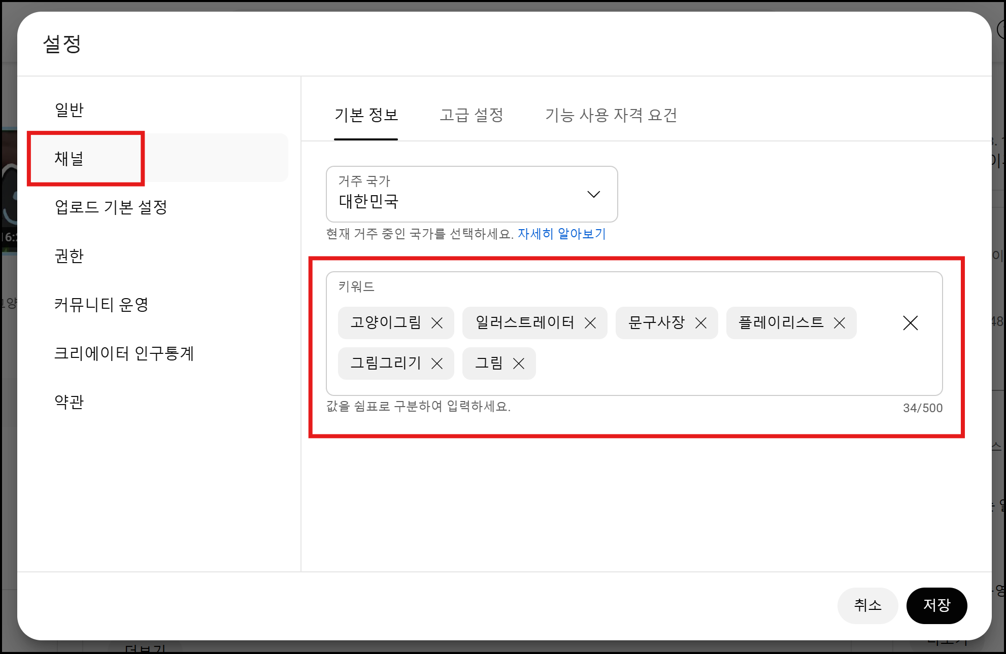 왼쪽 메뉴에서 설정 > 채널 > 키워드 칸에 키워드를 적어줍니다.