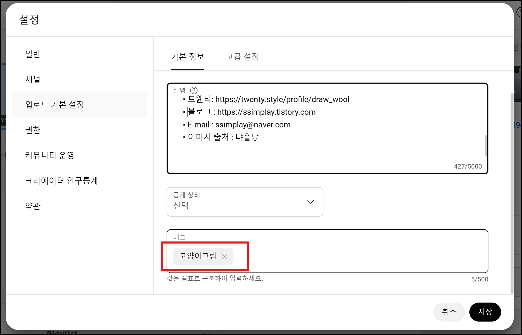 아까 채널 설정을 하고 나서 바로 아래에 업로드 기본 설정이 있습니다. 동일하게 왼쪽 메뉴 설정 > 업로드 기본 설정 > 기본 정보 기입 해줍니다.